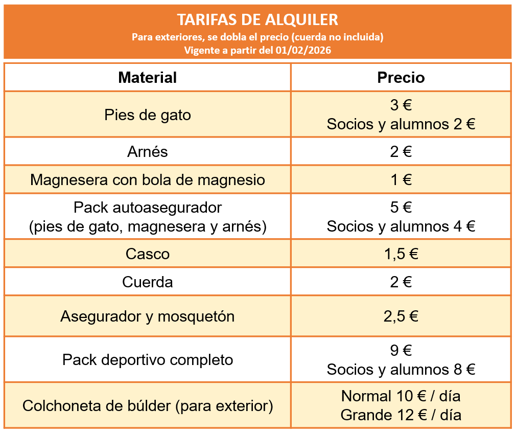 Ten en cuenta que estas tarifas son sólo para el material que alquilamos para uso exclusivo en nuestras instalaciones. El material alquilado no se puede sacar de nuestras instalaciones. Si necesitas alquilar material (¡incluso colchonetas de búlder!) para usarlo fuera de las instalaciones (exterior), se aplica una tarifa distinta a la habitual; consúltanos.