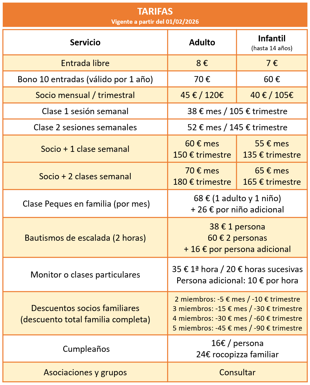- Entrada libre: Disfruta de todas las instalaciones durante todo el día, sin límite de tiempo. No incluye material de escalada ni monitor. Si se están impartiendo clases, puedes escalar pero respetando los espacios lectivos del momento.